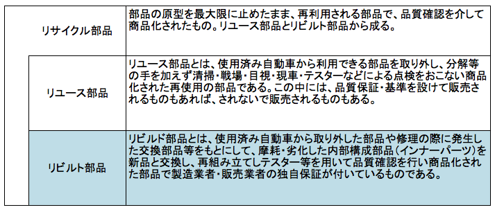 再度使用するために、整備・検査された中古の部品のことです。一般的に通常の中古品(リユース品)は整備・検査されないものを言いますが、整備・検査されていて、品質がキチンと担保(保証)されている点が大きく異なる点です。